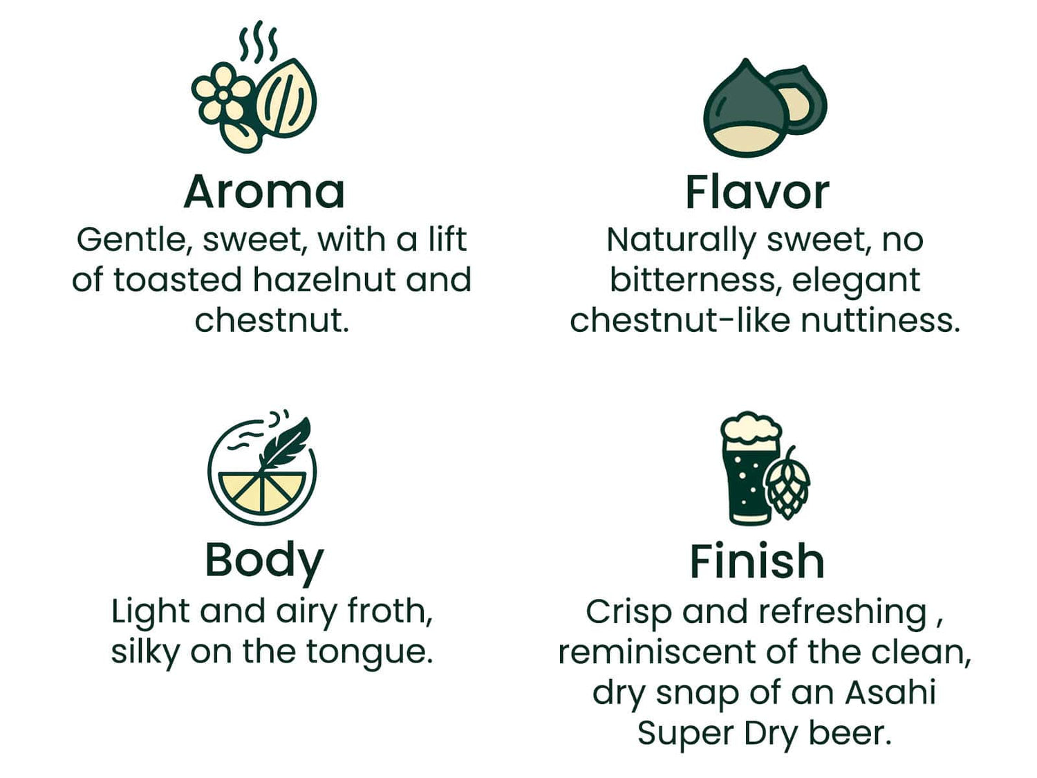 Tenmyo is naturally sweet and elegant, with no trace of bitterness. Its light and airy body carries a gentle toasted chestnut note, finishing crisp and refreshing, a clean taste that lingers with sophistication.